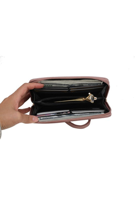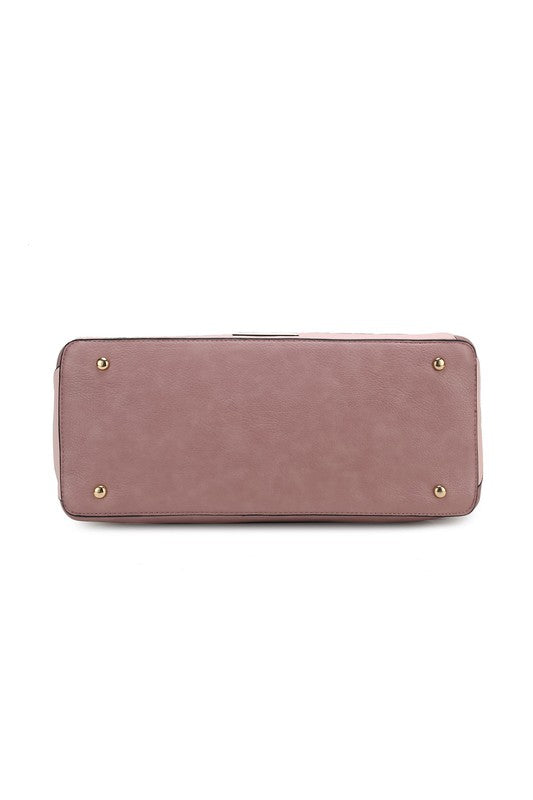POCKETS: 1 exterior zipper pocket, 2 interior pockets, 1 interior zipper pocket with our signature Mia K. Collection Plate.