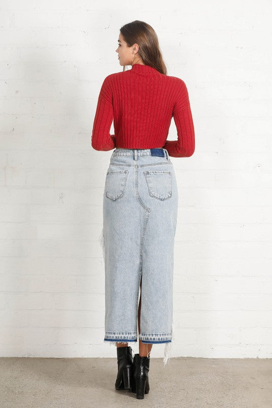 HIGH RISE DISTRESSED DENIM MAXI SKIRT