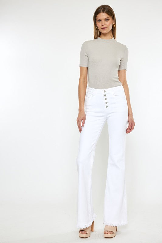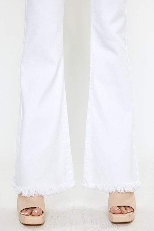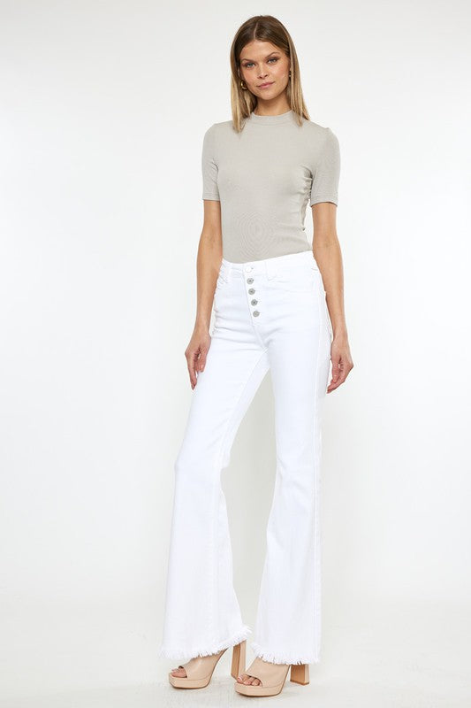 Add a refreshing touch to your wardrobe with the "High Rise White Flare Jeans." With a high-rise waist, these jeans offer a flattering fit while the white color exudes a sense of elegance and versatility. The flare leg design adds a stylish and retro-inspired element, making these jeans a versatile choice to effortlessly create chic and summery outfits.